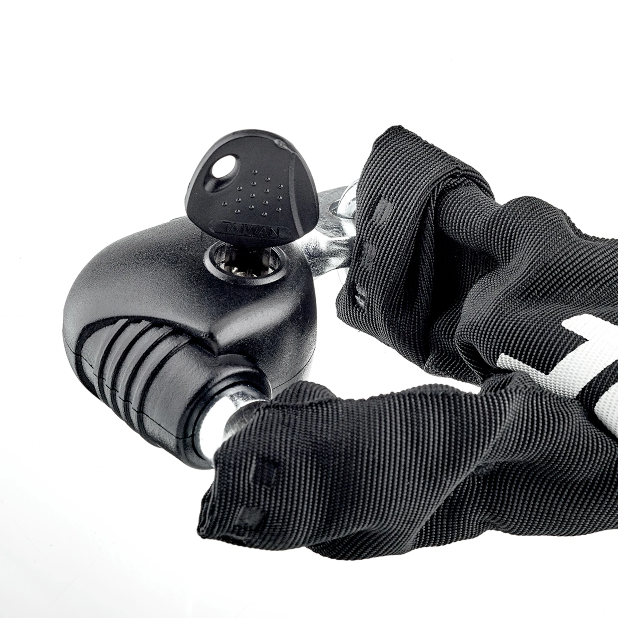 Étant basé sur des maillons de chaîne d’env. 10 mm d’épaisseur, cet antivol de vélo solide tient bien tête aux tentatives brutales de crochetage. Aussi, faisant environ un mètre de longueur, il permet d’attacher votre vélo sans un grand effort à des objets fixes. Puisqu’elles sont symétriques, on introduit facilement les quatre clés, qui sont livrées avec, depuis les deux côtés dans le cylindre de serrure.